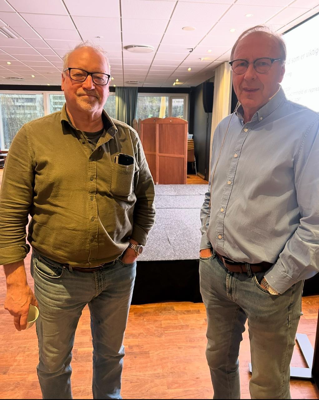 Erfaring i bøttar og spann. Frå venstre: Brøytebilsjåfør Ole Furnes og senioringeniør Kjell Haukeberg