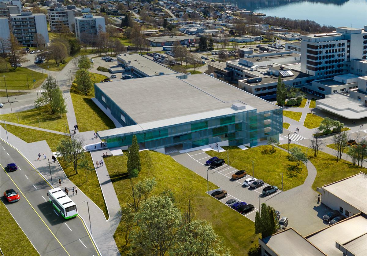 Sunnmøre Parkering har oppført eit moderne parkeringshus med plass til om lag 600 bilar. Bygget er fleksibelt, har god kapasitet og gir moglegheit for utvikling for Helse Møre og Romsdal på fleire områder. Bygget er eit sentralt bindeledd mellom sjukehuset og kollektivknutepunktet og inneheld både heis og trapp ned til den nye hovudinngangen.