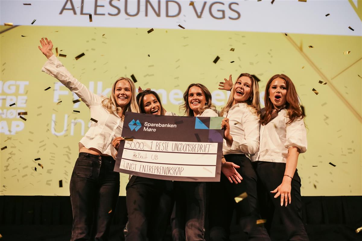 ReBait UB frå Ålesund vgs med synleg bevis på at dei er den beste ungdomsbedrifta i fylket. Frå venstre: Anna-Linn Sandvik Rødseth, Hana Elbehiry Slinning, Natalie Sandvik, Johanne Eldøy, Sofie Ellingseter Bjørkevoll.