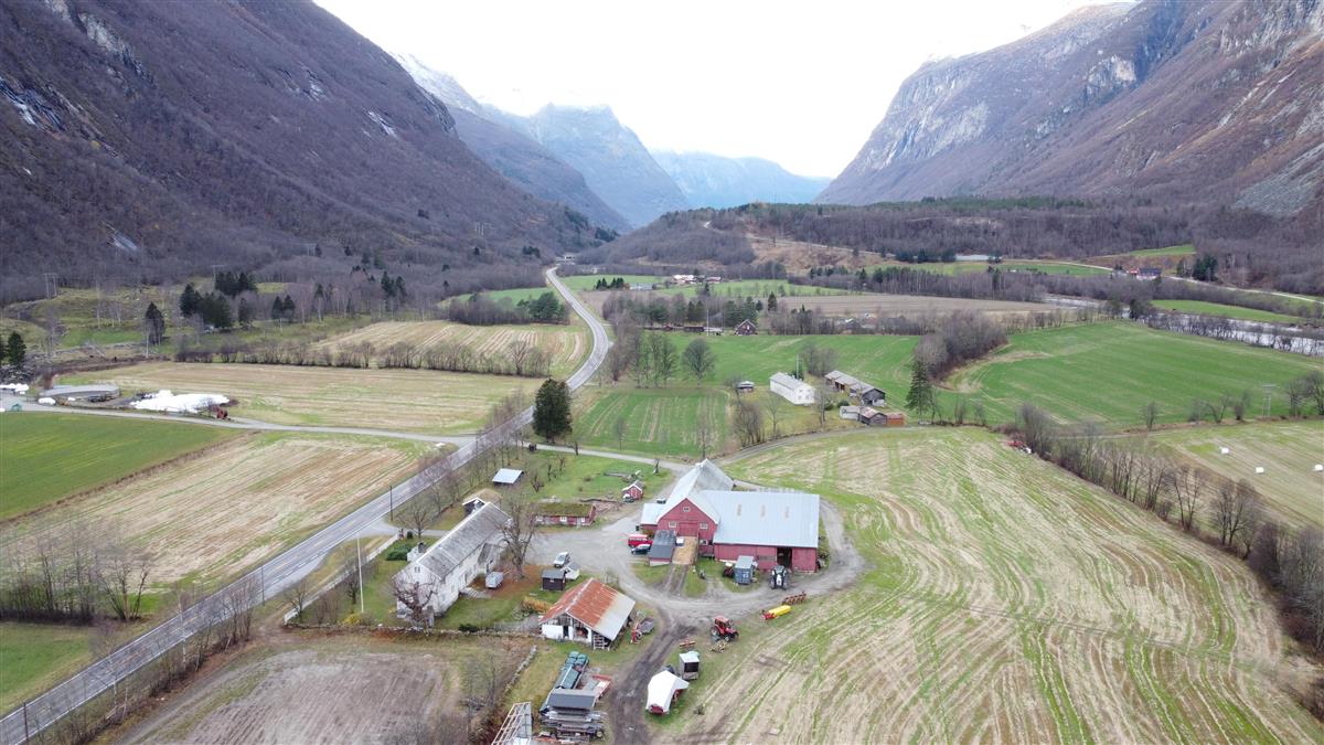 Garden Østigard ligg nærmast, nabogard Utigard med låven sjåast i høgre del av bildet.